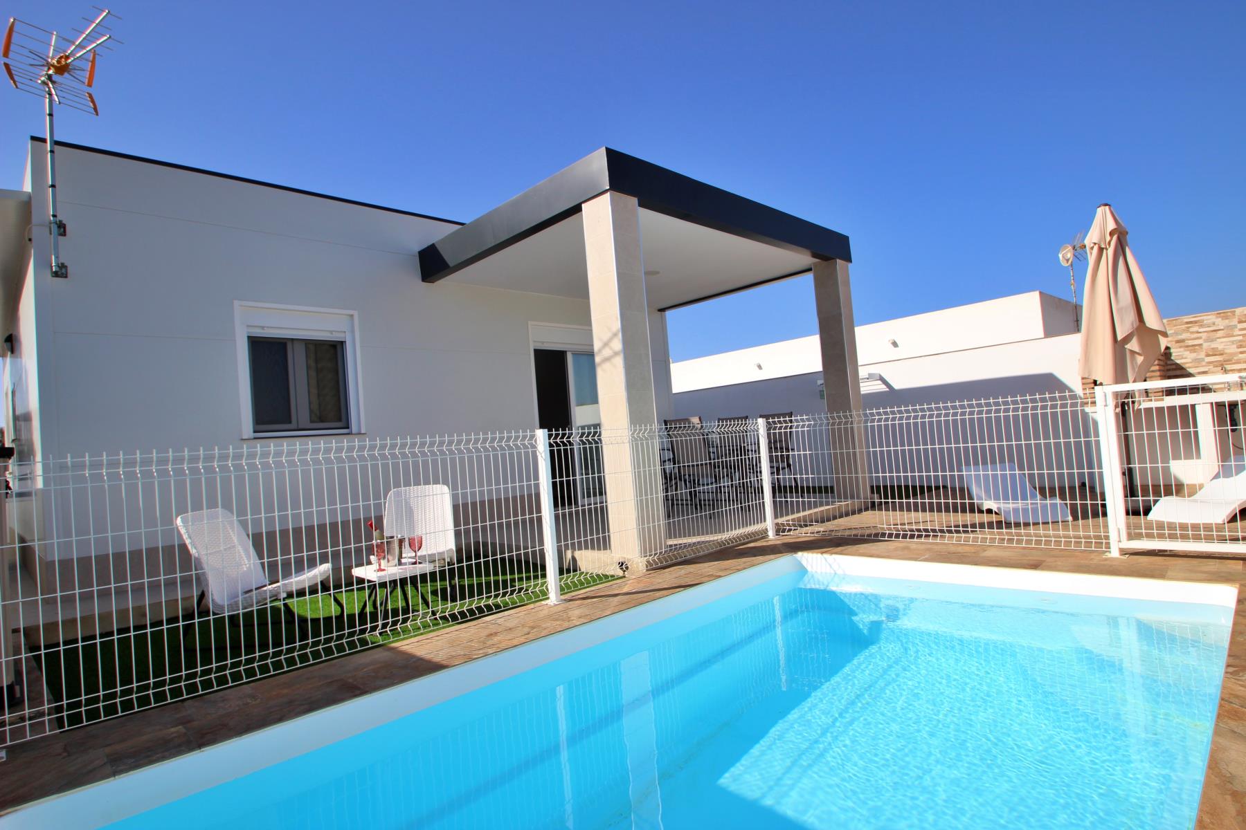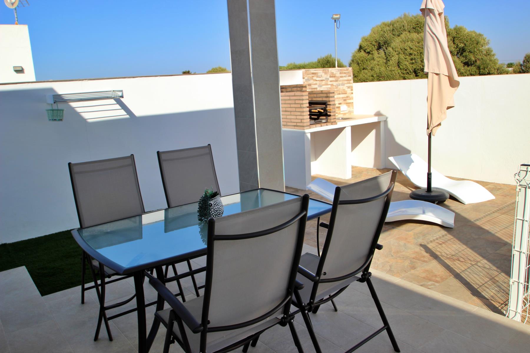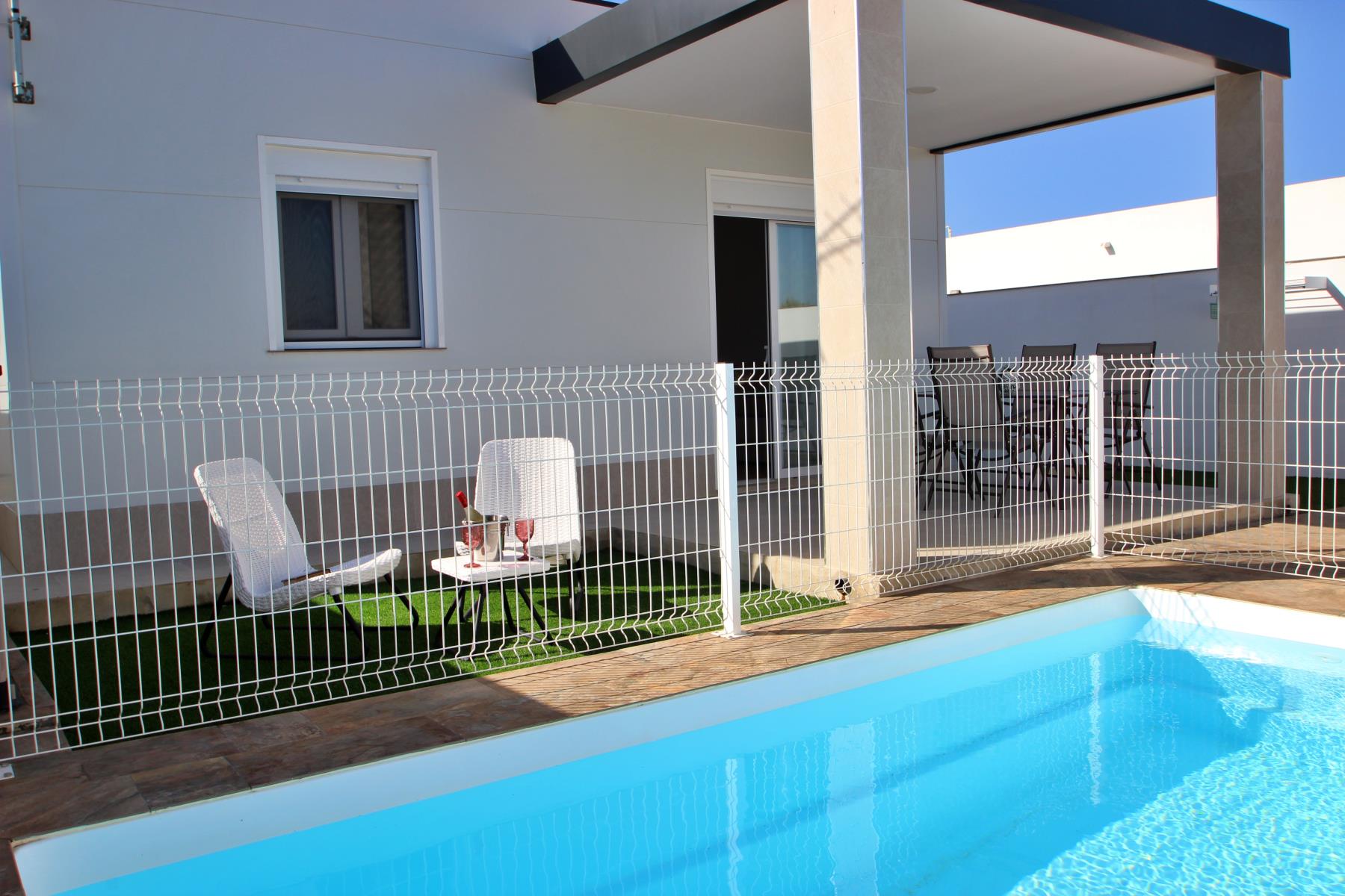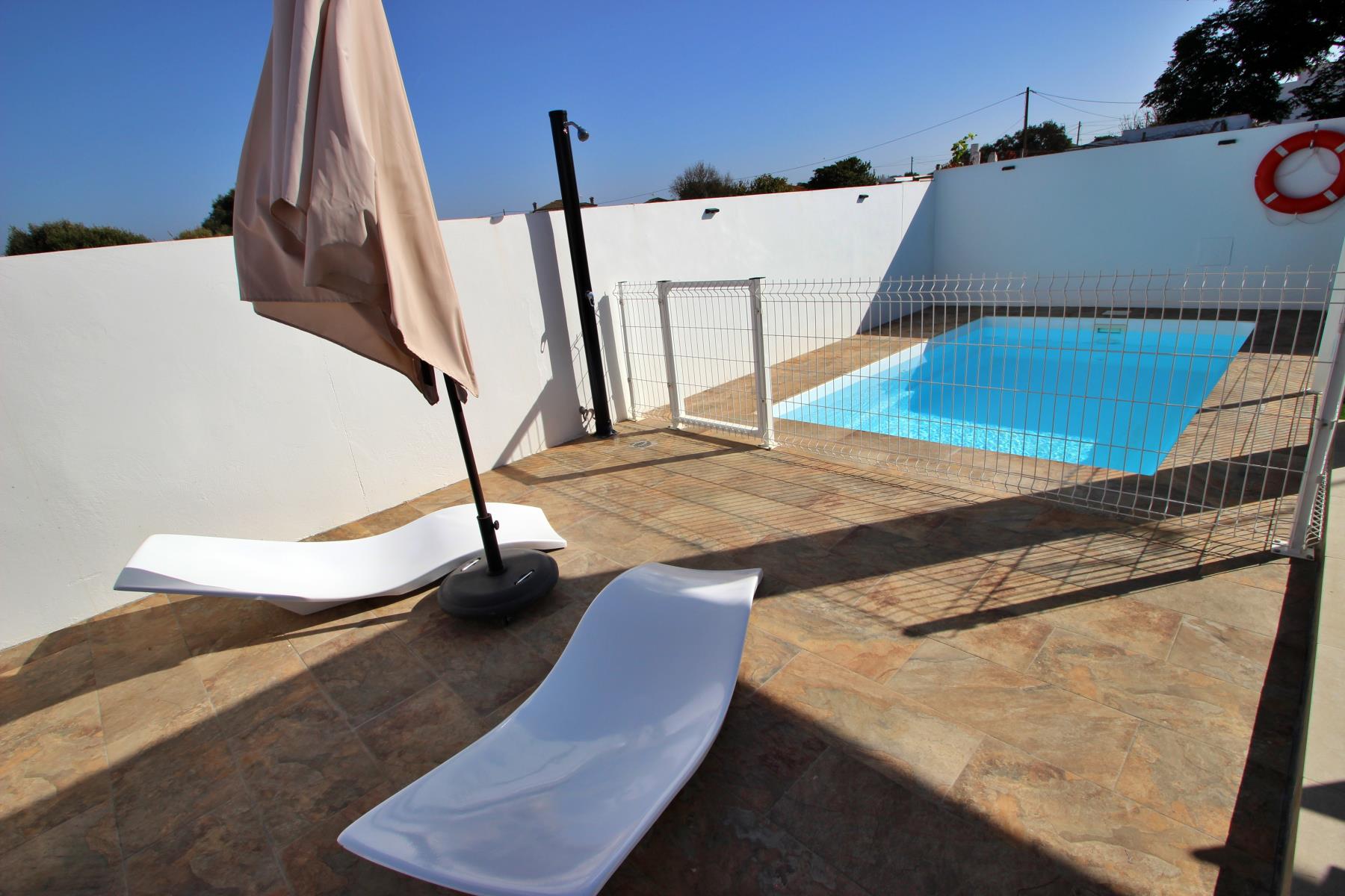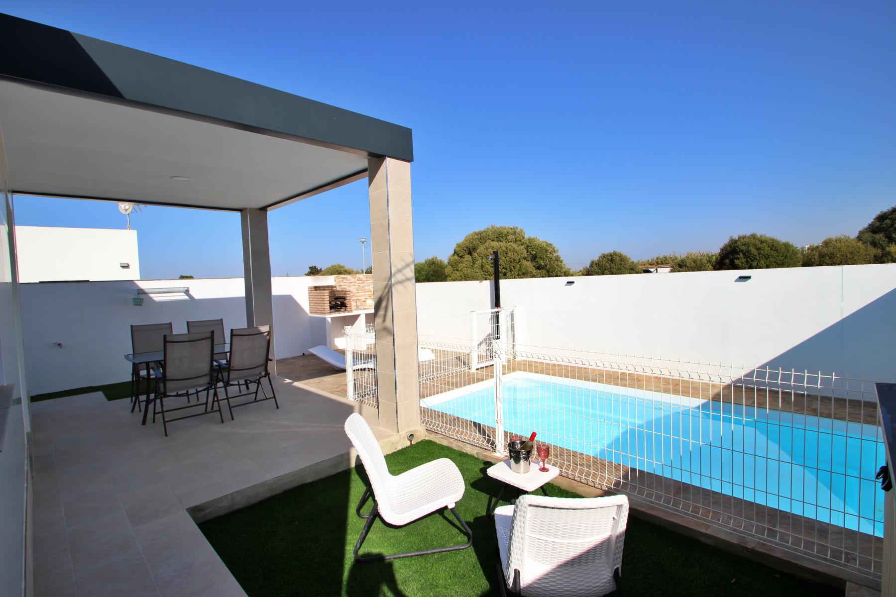 Outdoors, the house invites you to make the most of the pleasant climate with a covered terrace furnished with a table and chairs, perfect for outdoor meals or relaxing evenings. Next to it, there is a barbecue area and a private, fenced swimming pool (4.5 × 2.5 m, 1.40 m deep), equipped with sun loungers, a parasol, and a cozy chill-out area, ideal for sunbathing or enjoying a safe swim with children.