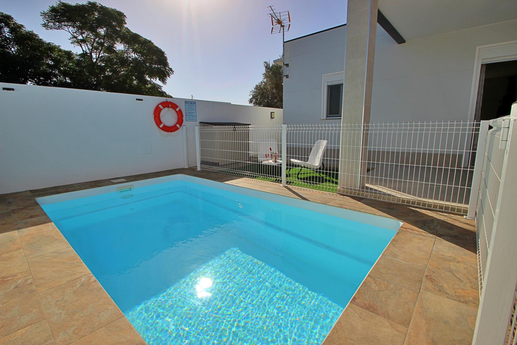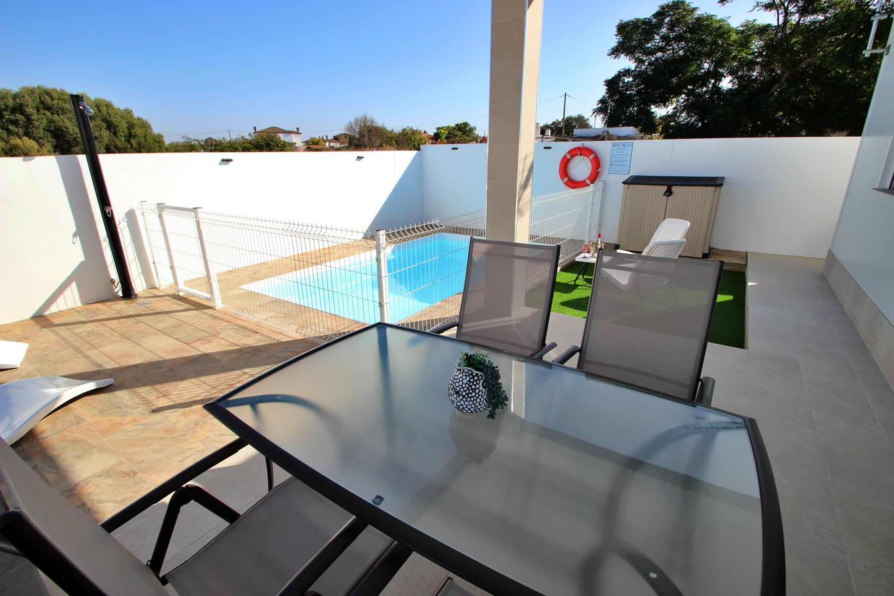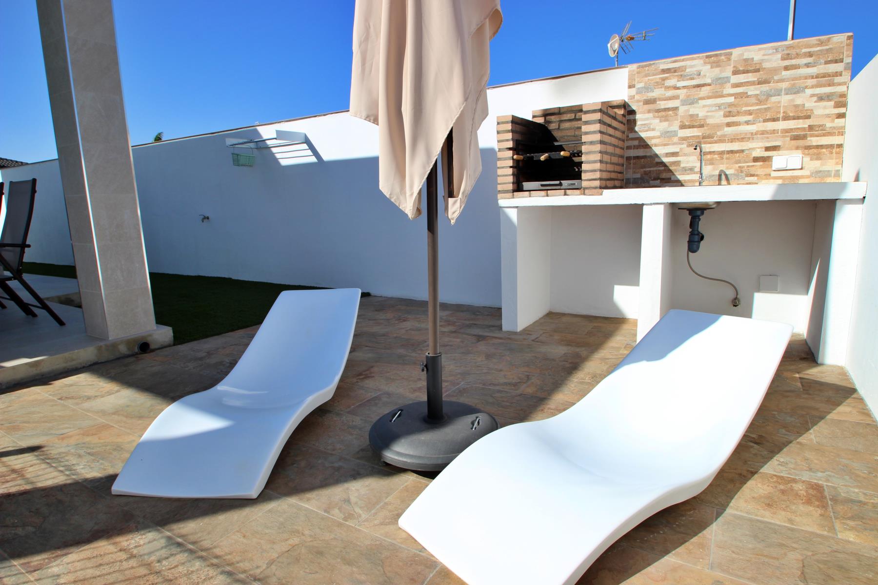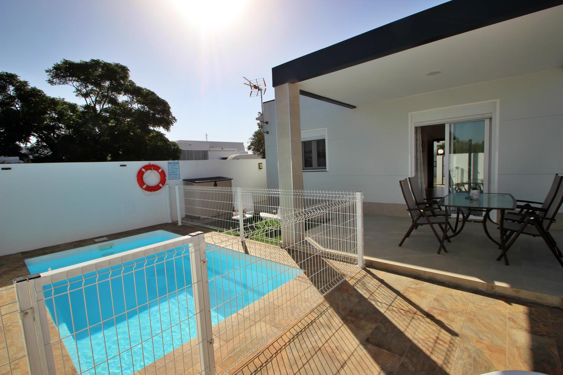 Outdoors, the house invites you to make the most of the pleasant climate with a covered terrace furnished with a table and chairs, perfect for outdoor meals or relaxing evenings. Next to it, there is a barbecue area and a private, fenced swimming pool (4.5 × 2.5 m, 1.40 m deep), equipped with sun loungers, a parasol, and a cozy chill-out area, ideal for sunbathing or enjoying a safe swim with children.