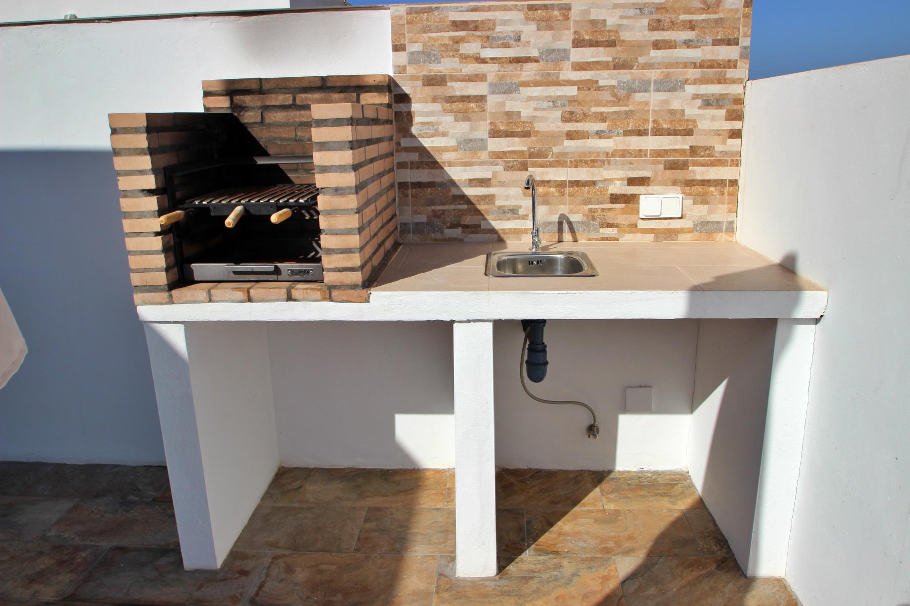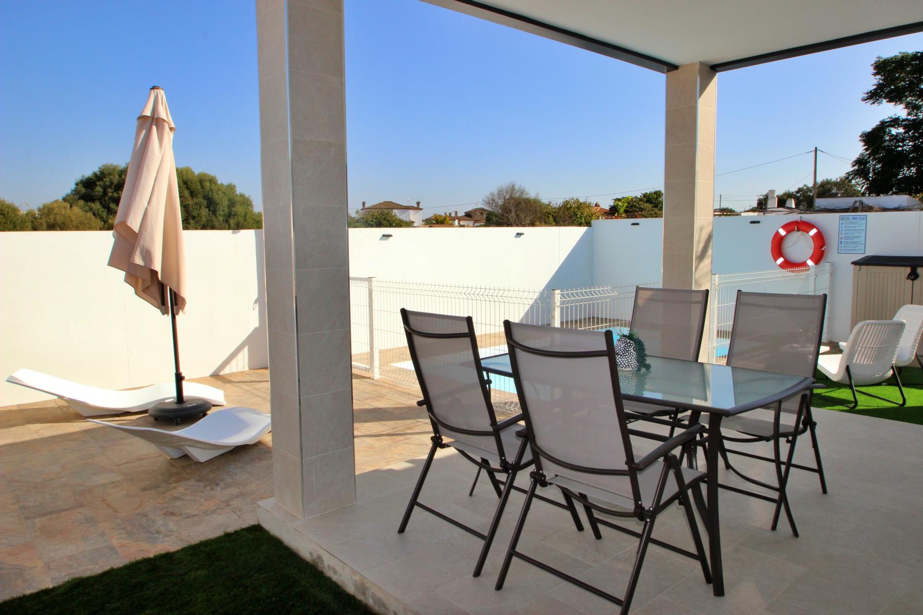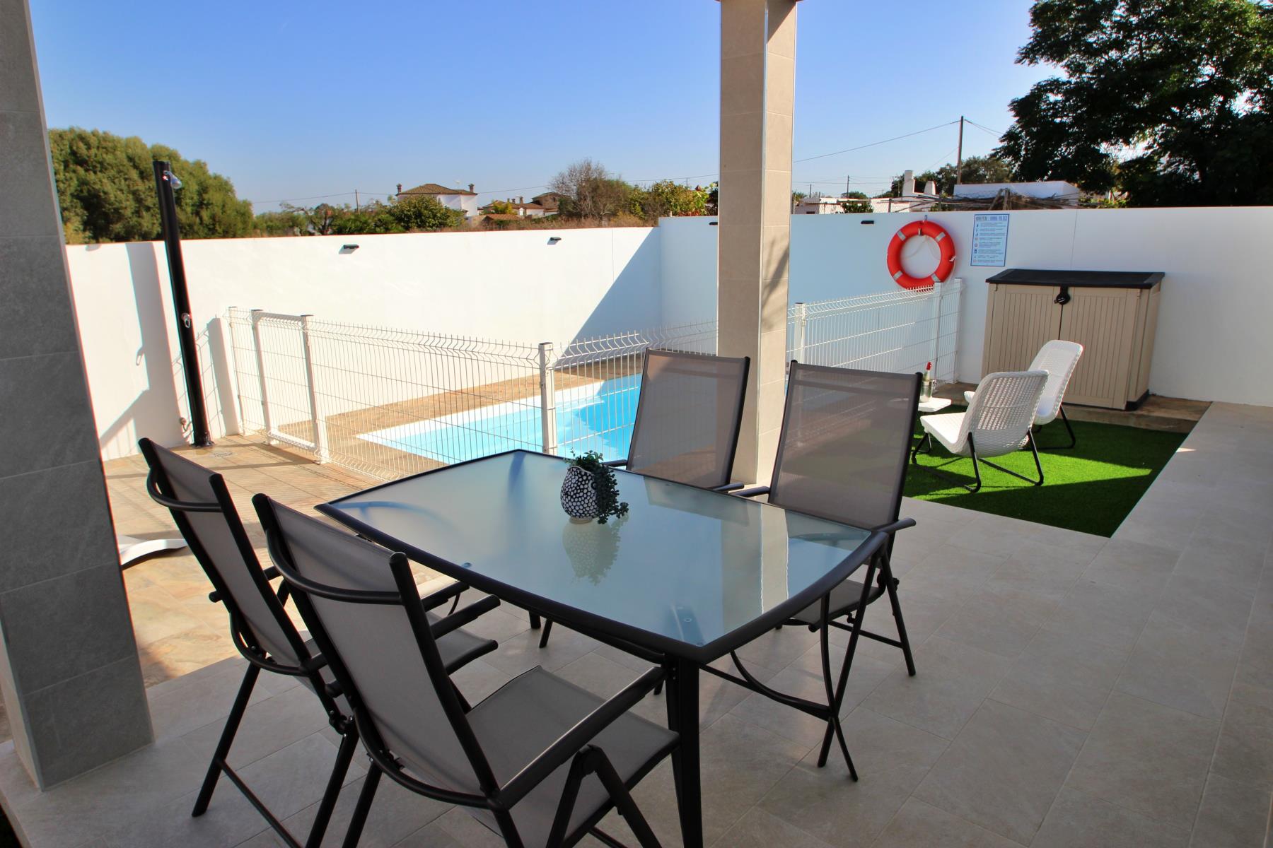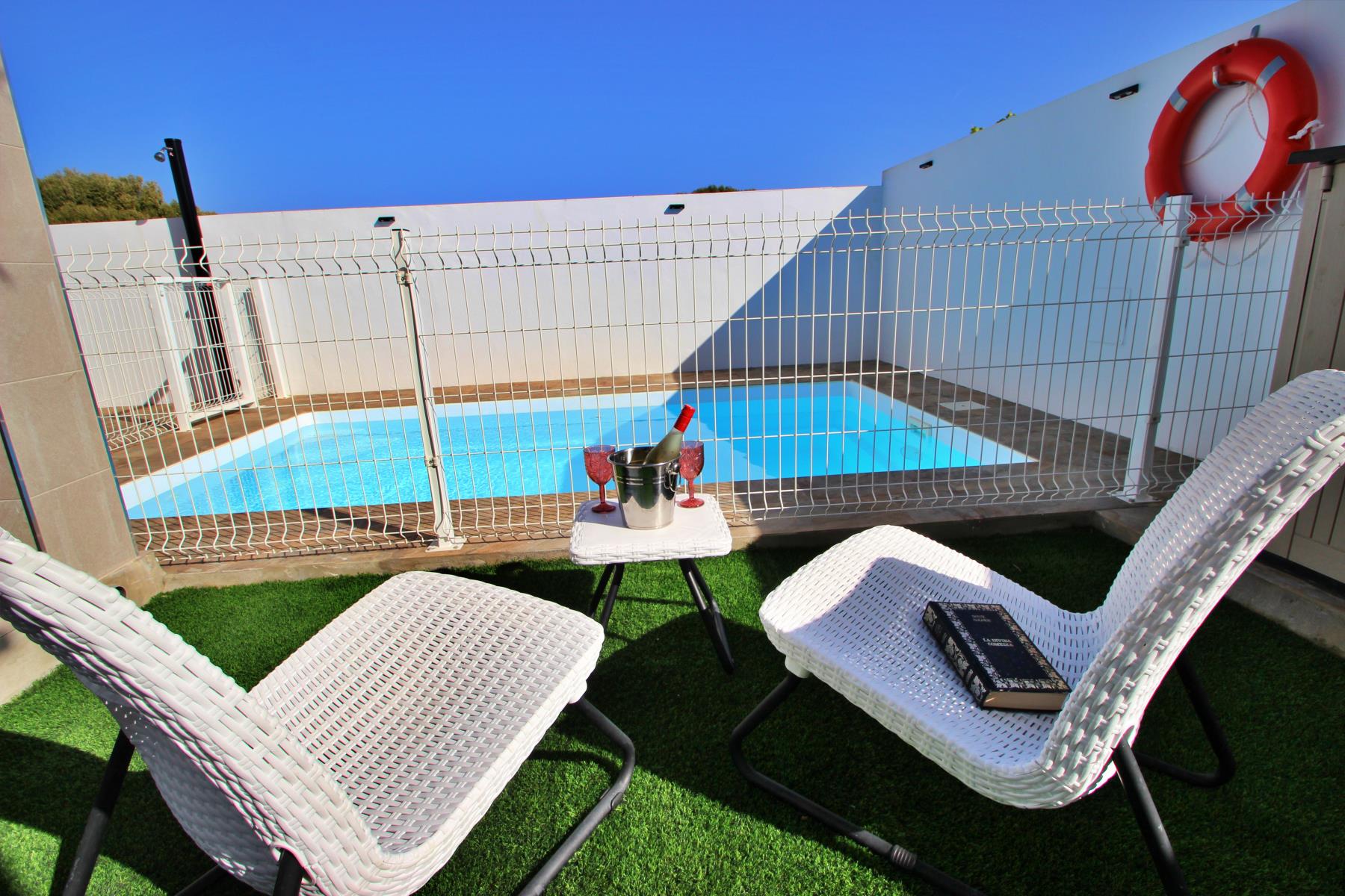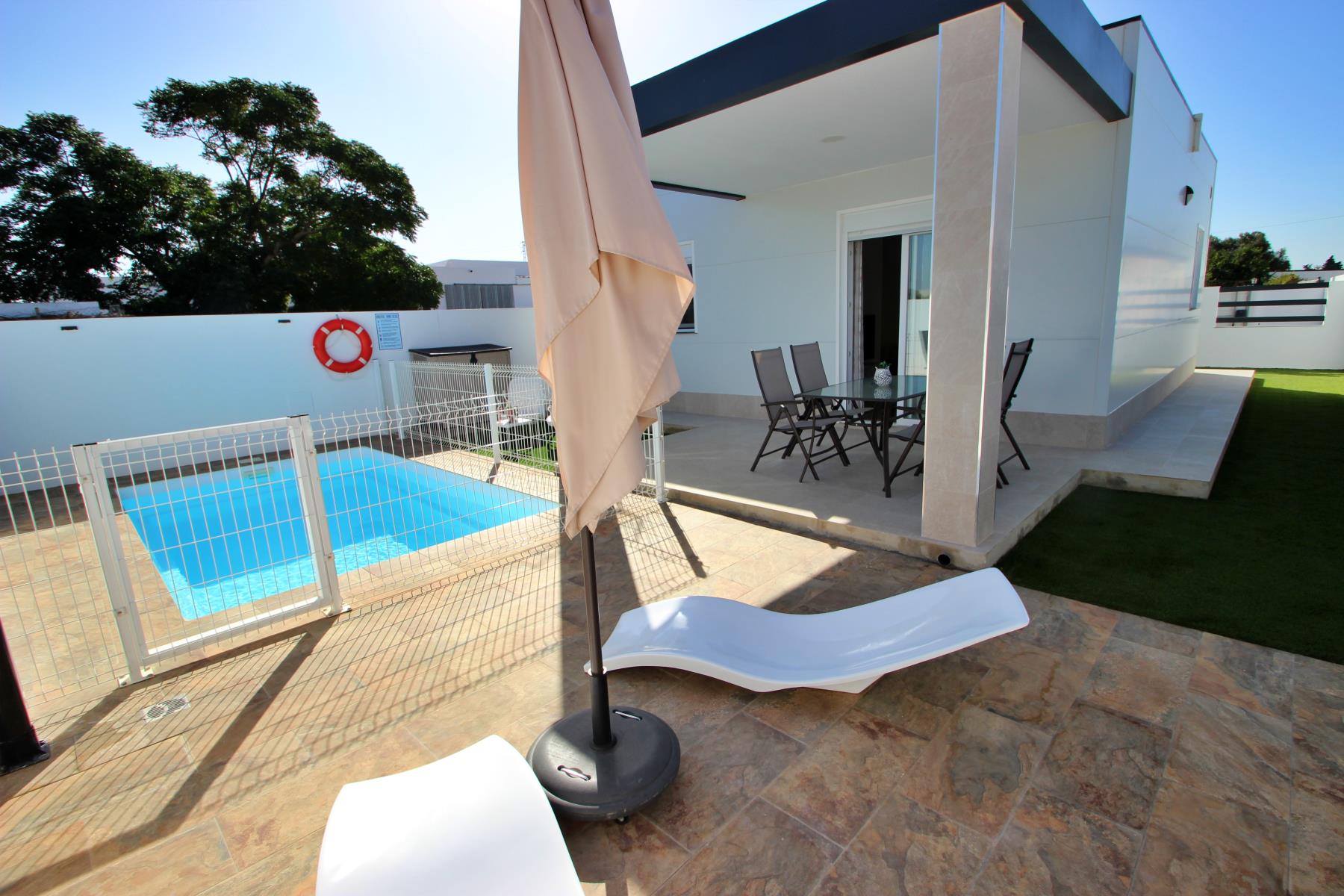 Outdoors, the house invites you to make the most of the pleasant climate with a covered terrace furnished with a table and chairs, perfect for outdoor meals or relaxing evenings. Next to it, there is a barbecue area and a private, fenced swimming pool (4.5 × 2.5 m, 1.40 m deep), equipped with sun loungers, a parasol, and a cozy chill-out area, ideal for sunbathing or enjoying a safe swim with children.