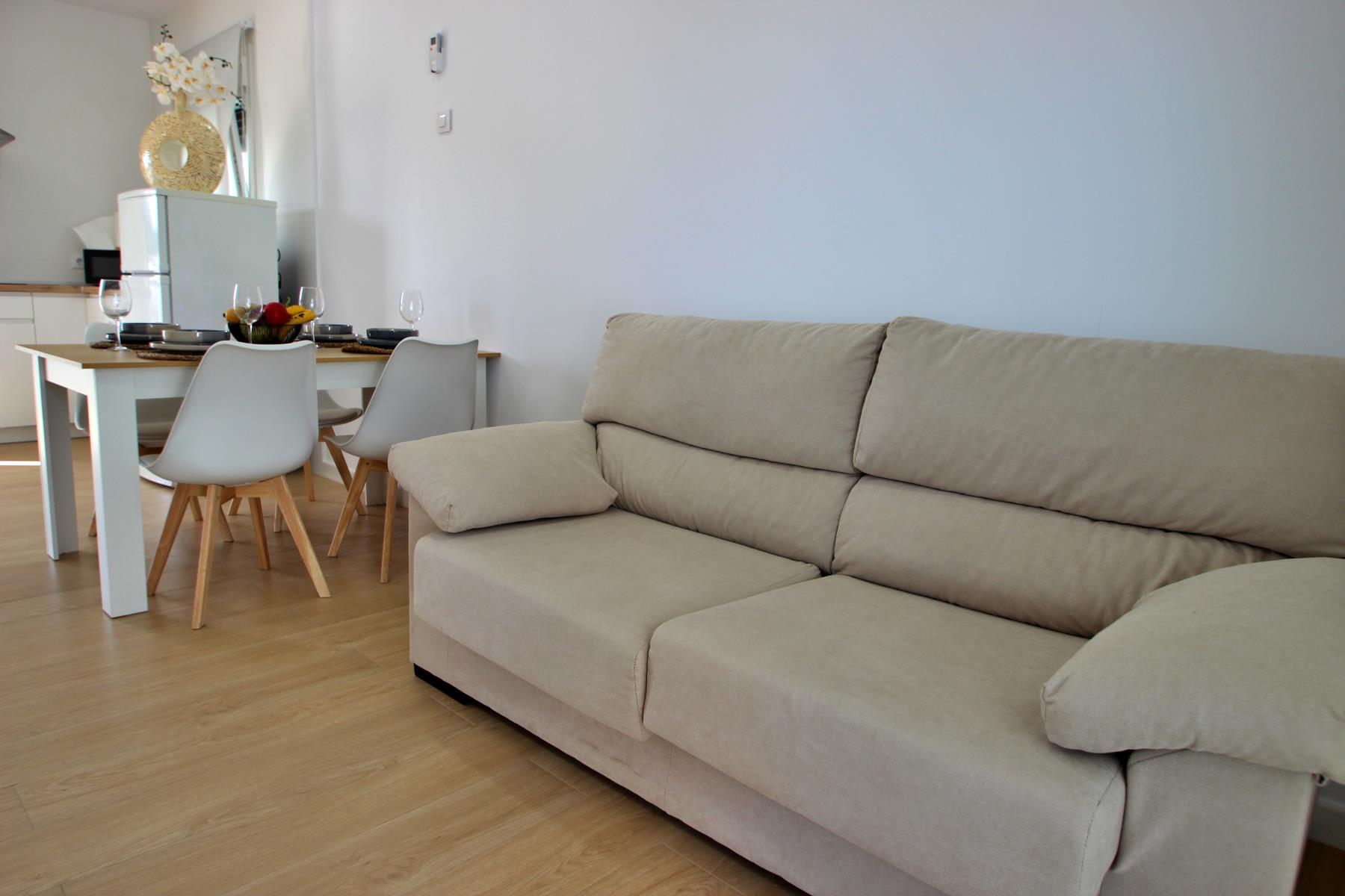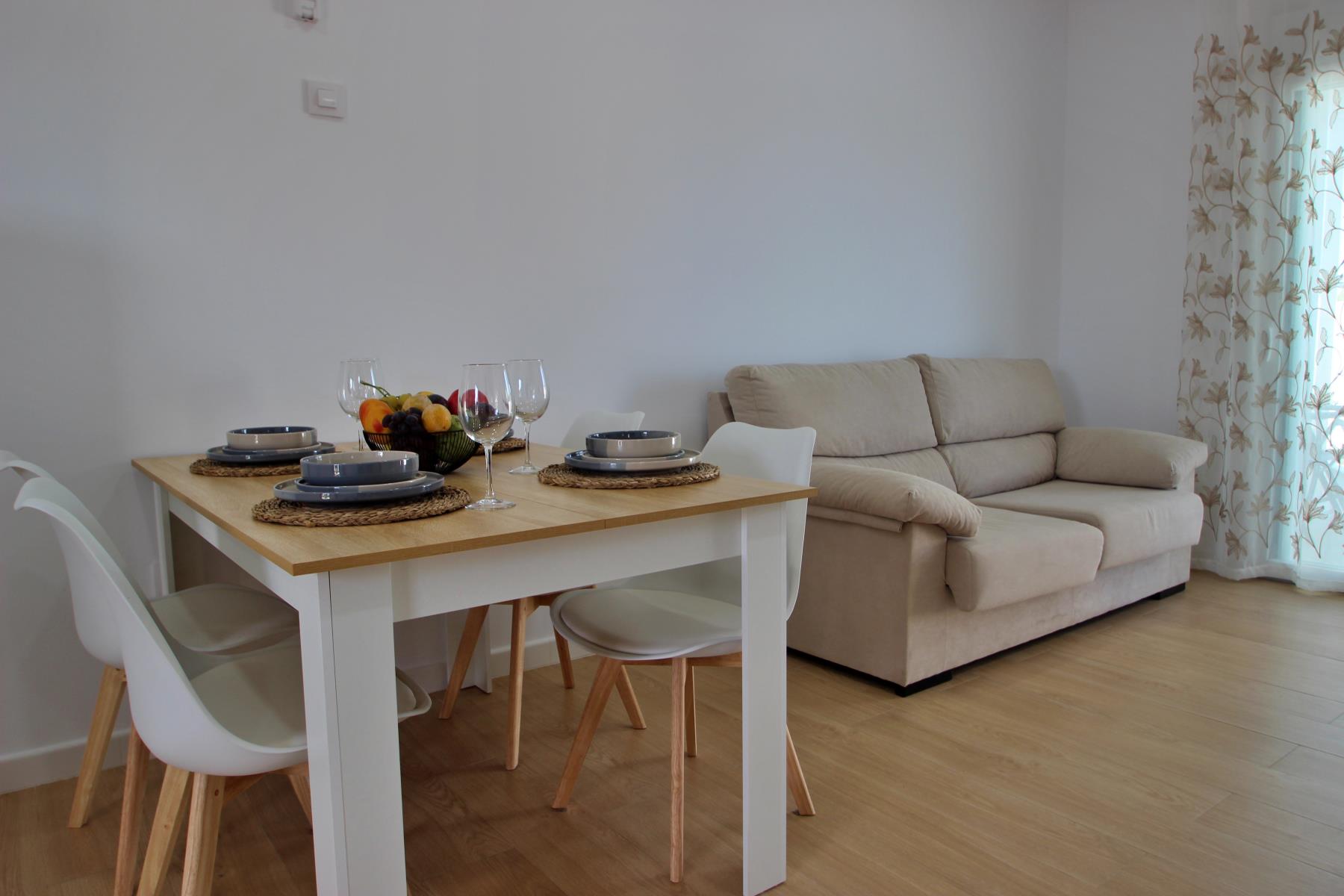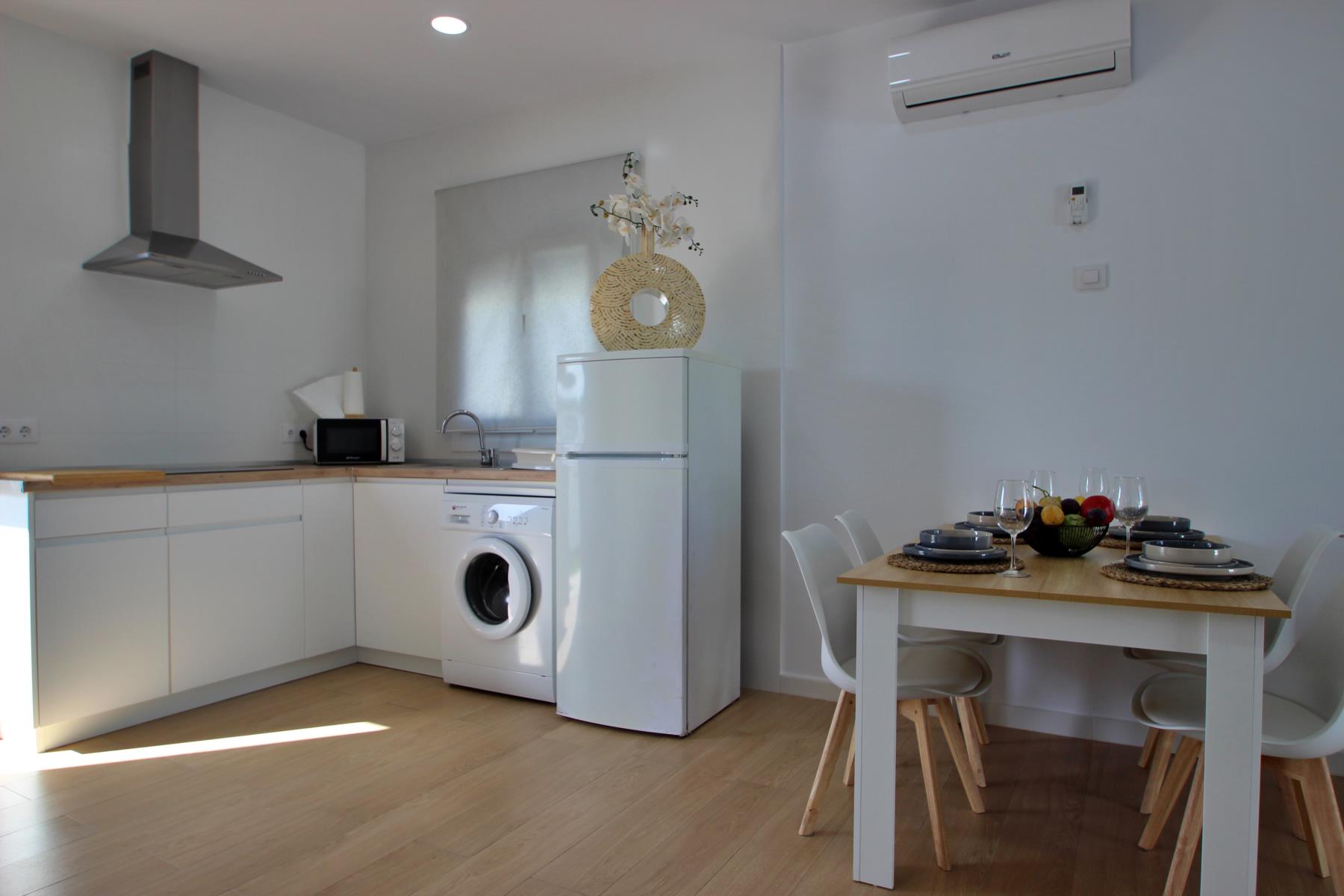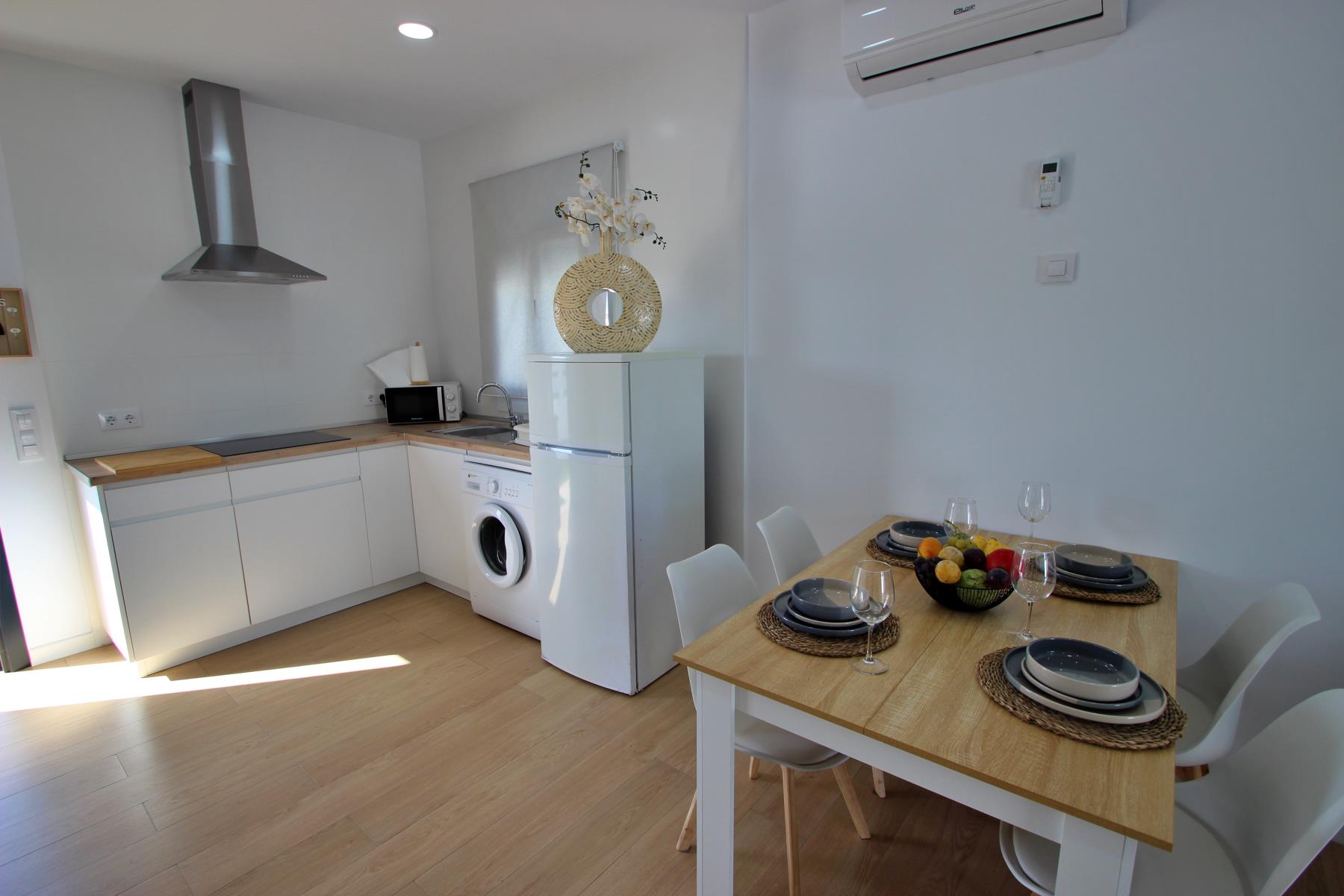 The bright and comfortable living-dining area includes a sofa, television with Spanish and international programs vía SAT, air conditioning, and Wi-Fi, creating the perfect space to unwind or enjoy family time. The open-plan kitchen blends seamlessly into the room and is fully equipped with a dishwasher, microwave-grill, ceramic hob, coffee maker, toaster, and all essential kitchenware. A washing machine is also available, making it ideal for longer stays.