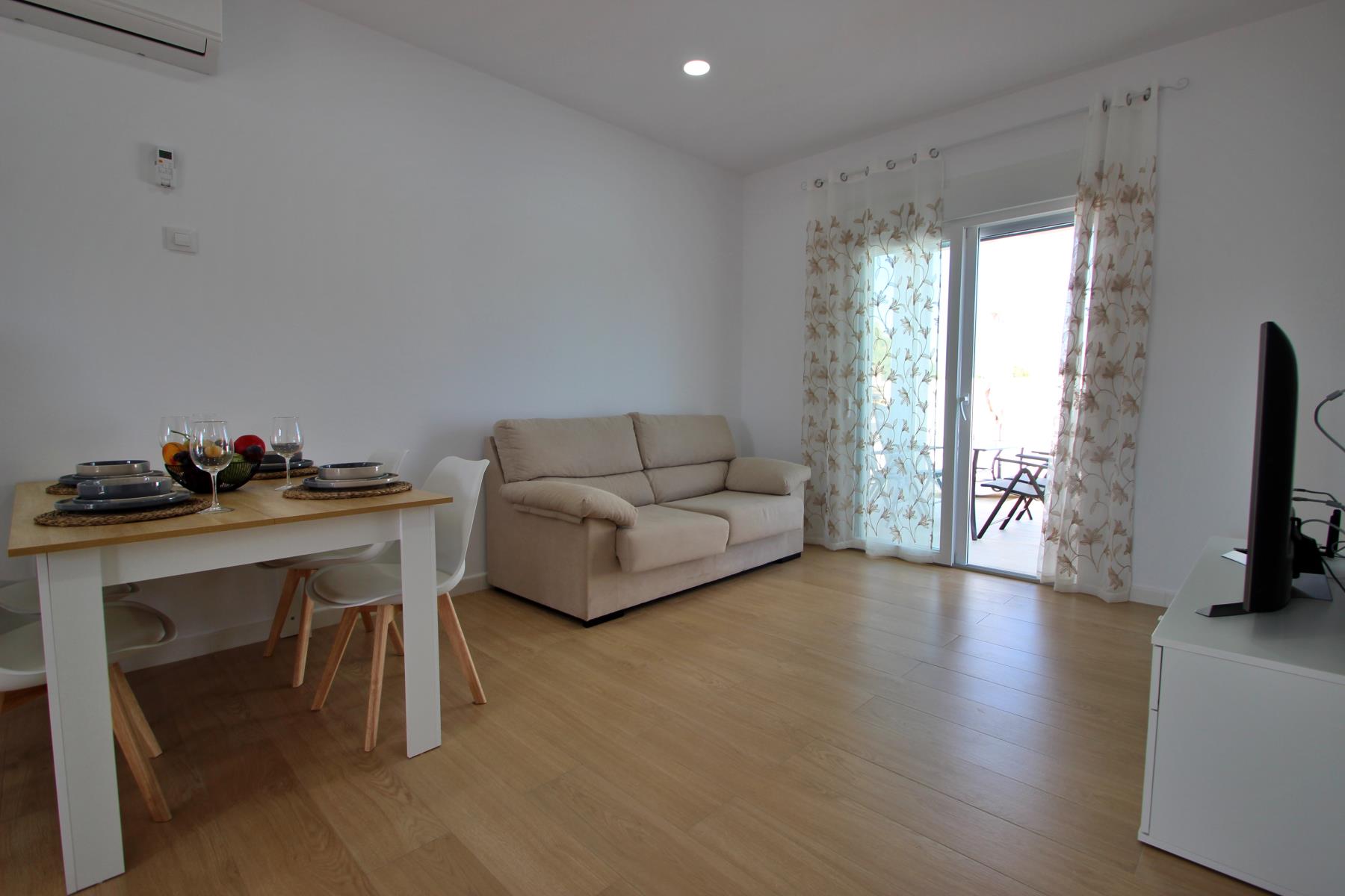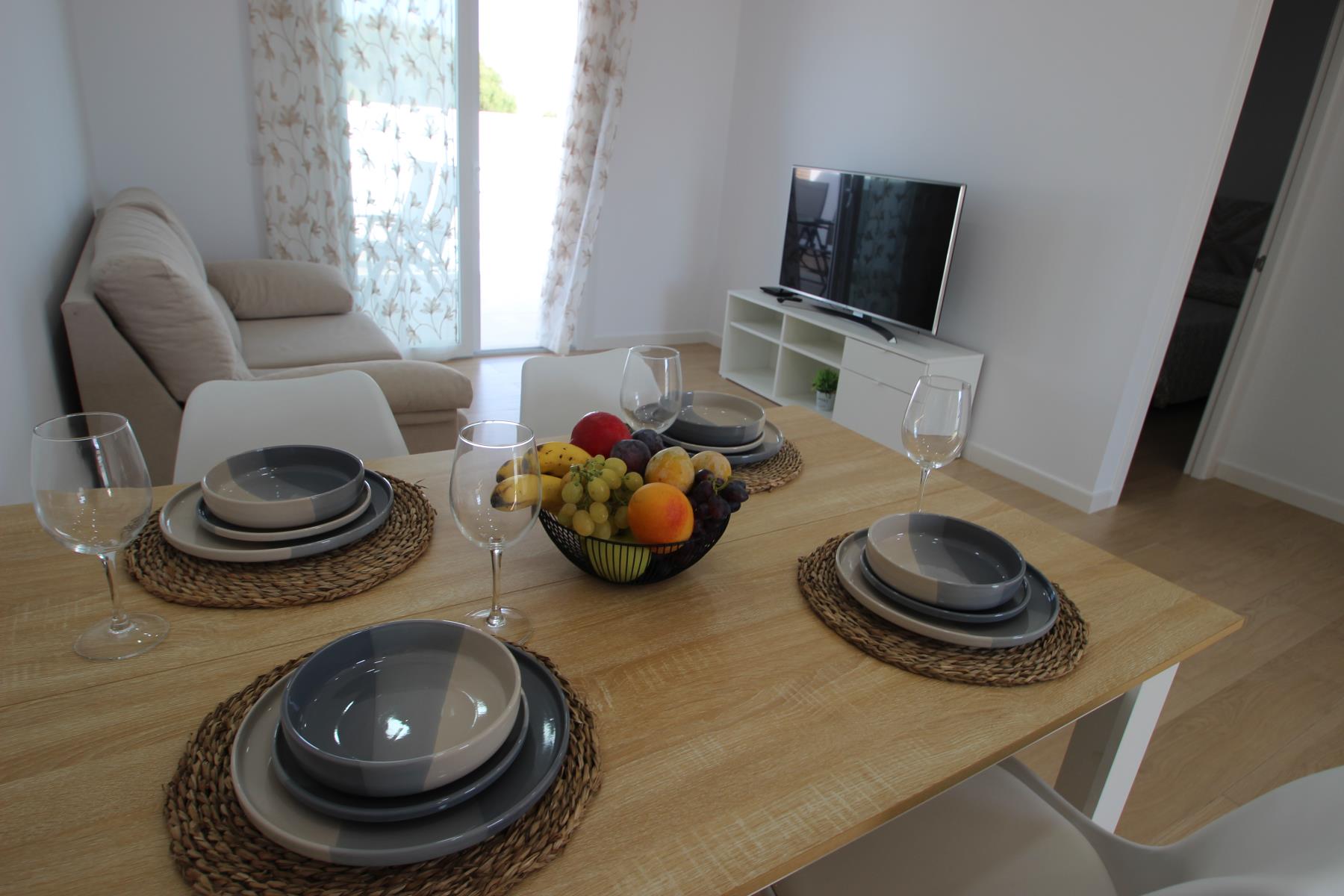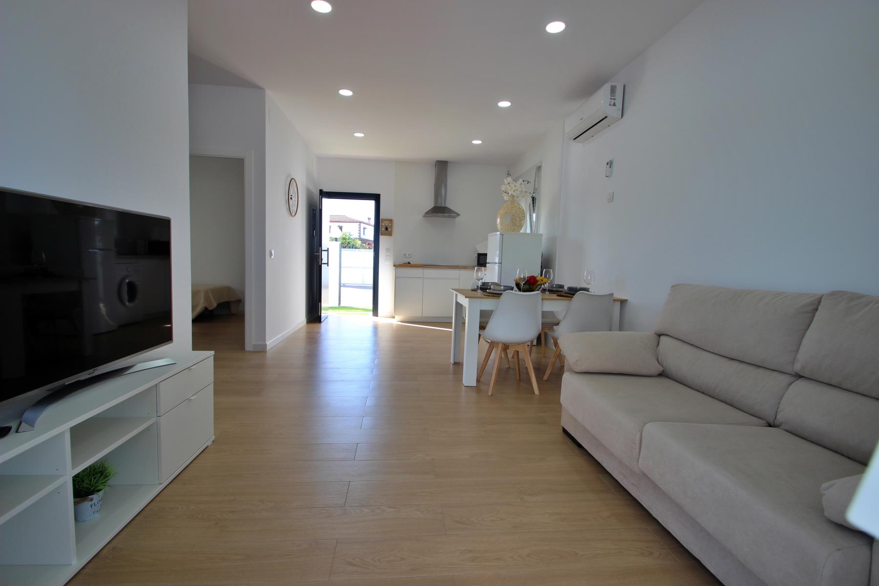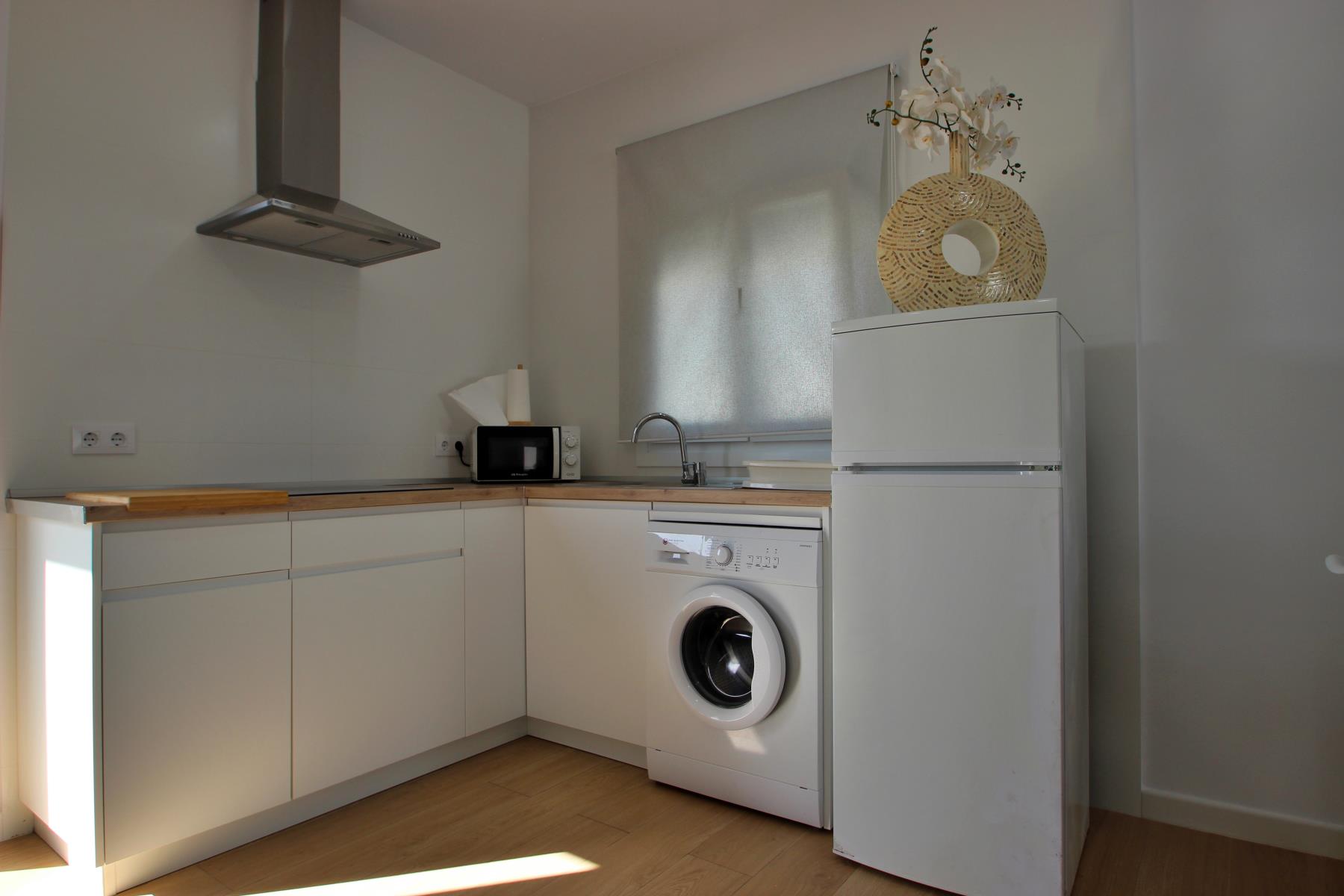 The bright and comfortable living-dining area includes a sofa, television with Spanish and international programs vía SAT, air conditioning, and Wi-Fi, creating the perfect space to unwind or enjoy family time. The open-plan kitchen blends seamlessly into the room and is fully equipped with a dishwasher, microwave-grill, ceramic hob, coffee maker, toaster, and all essential kitchenware. A washing machine is also available, making it ideal for longer stays.