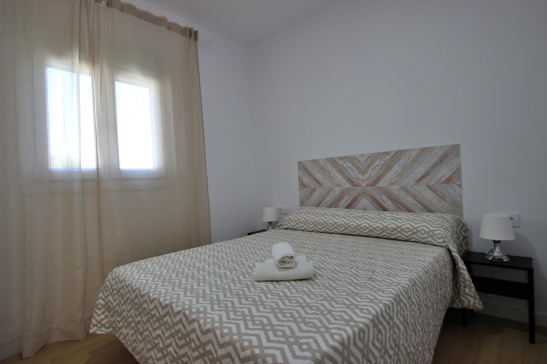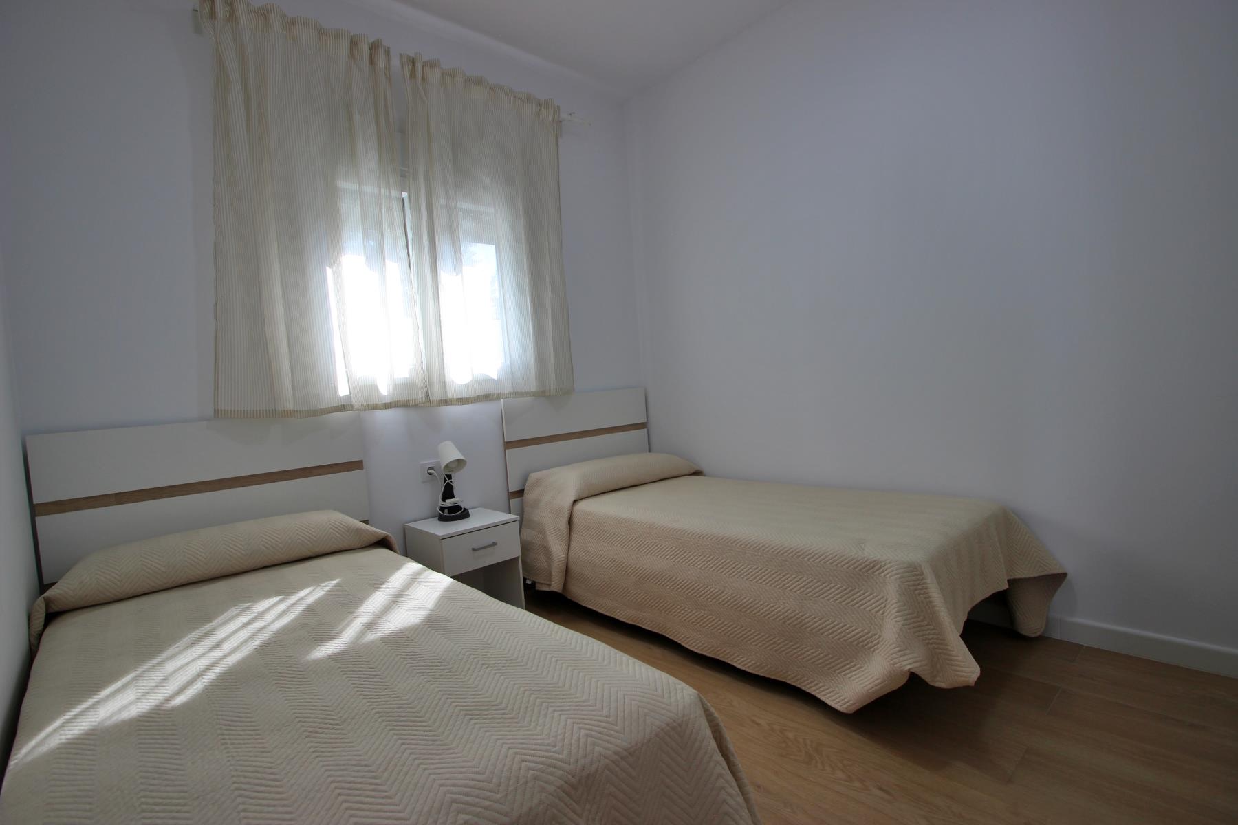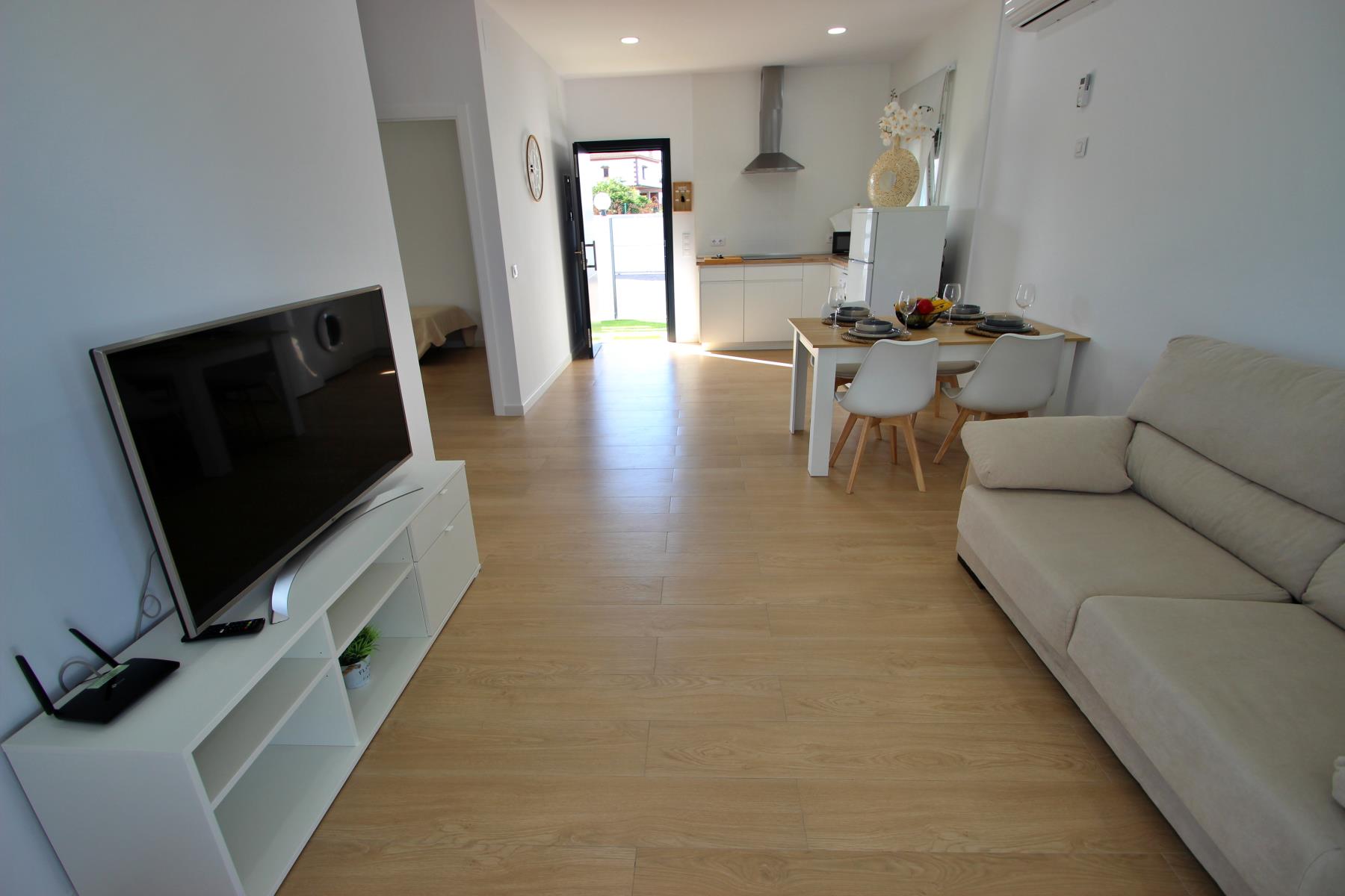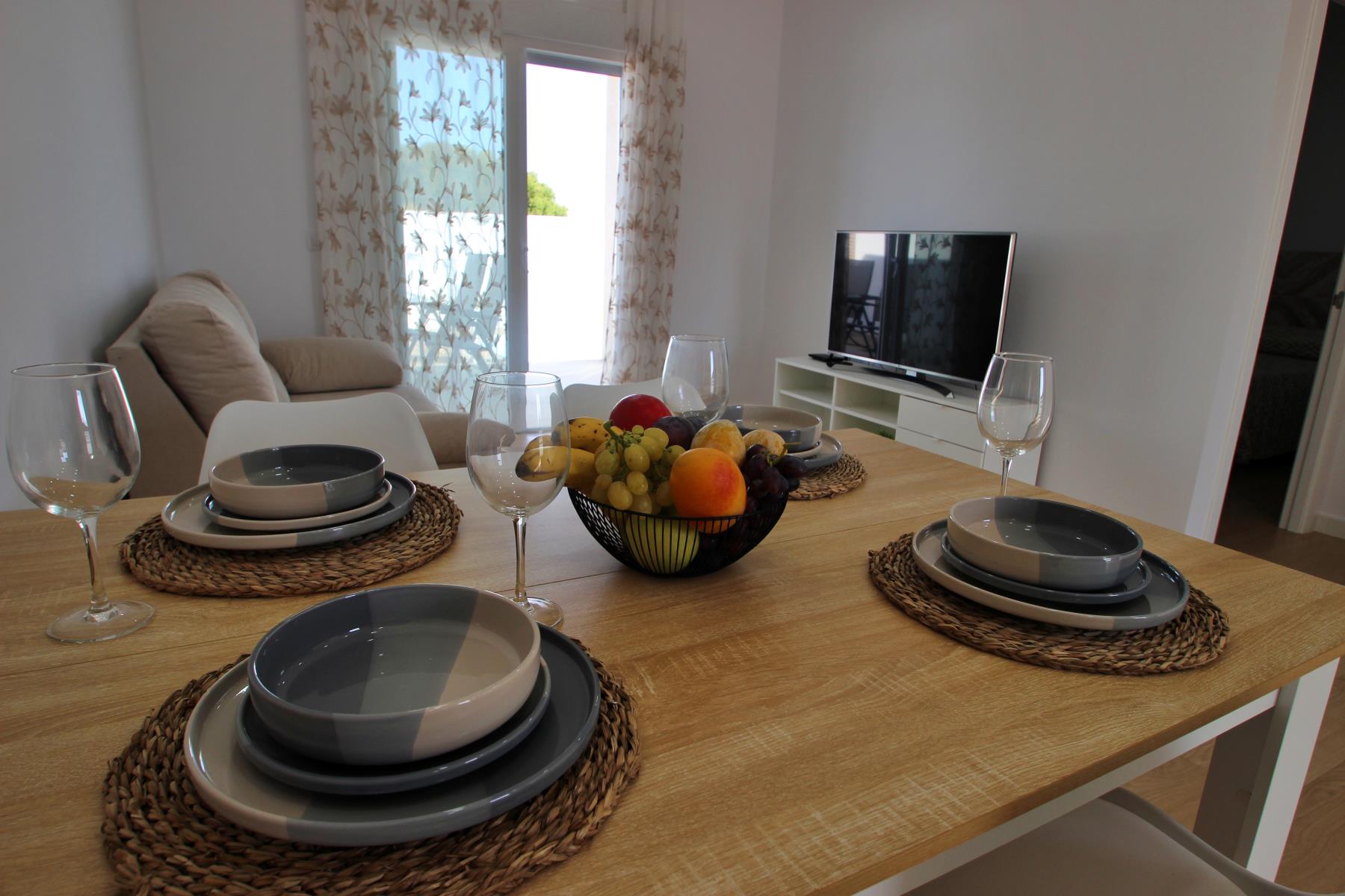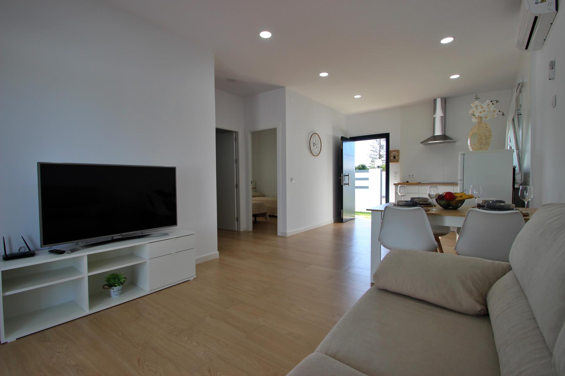 The bright and comfortable living-dining area includes a sofa, television with Spanish and international programs vía SAT, air conditioning, and Wi-Fi, creating the perfect space to unwind or enjoy family time. The open-plan kitchen blends seamlessly into the room and is fully equipped with a dishwasher, microwave-grill, ceramic hob, coffee maker, toaster, and all essential kitchenware. A washing machine is also available, making it ideal for longer stays.