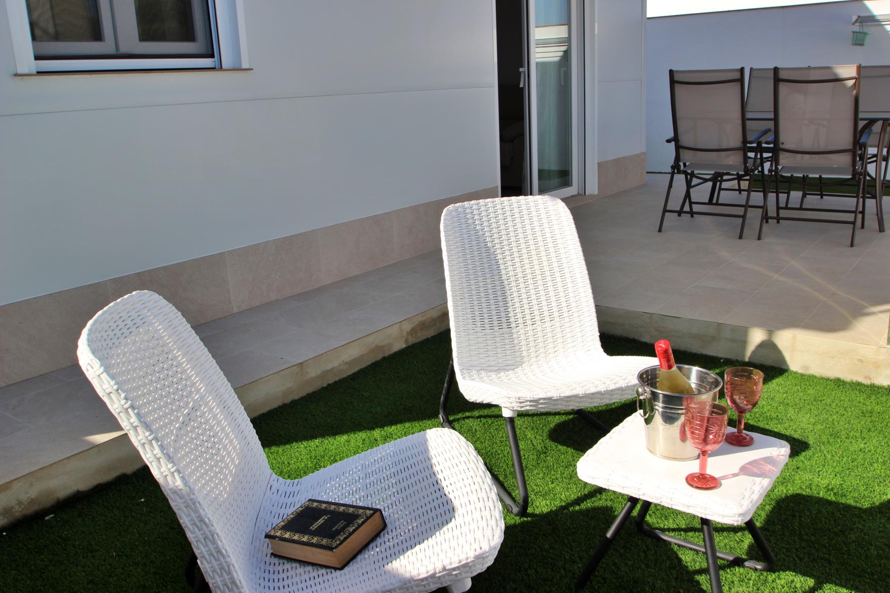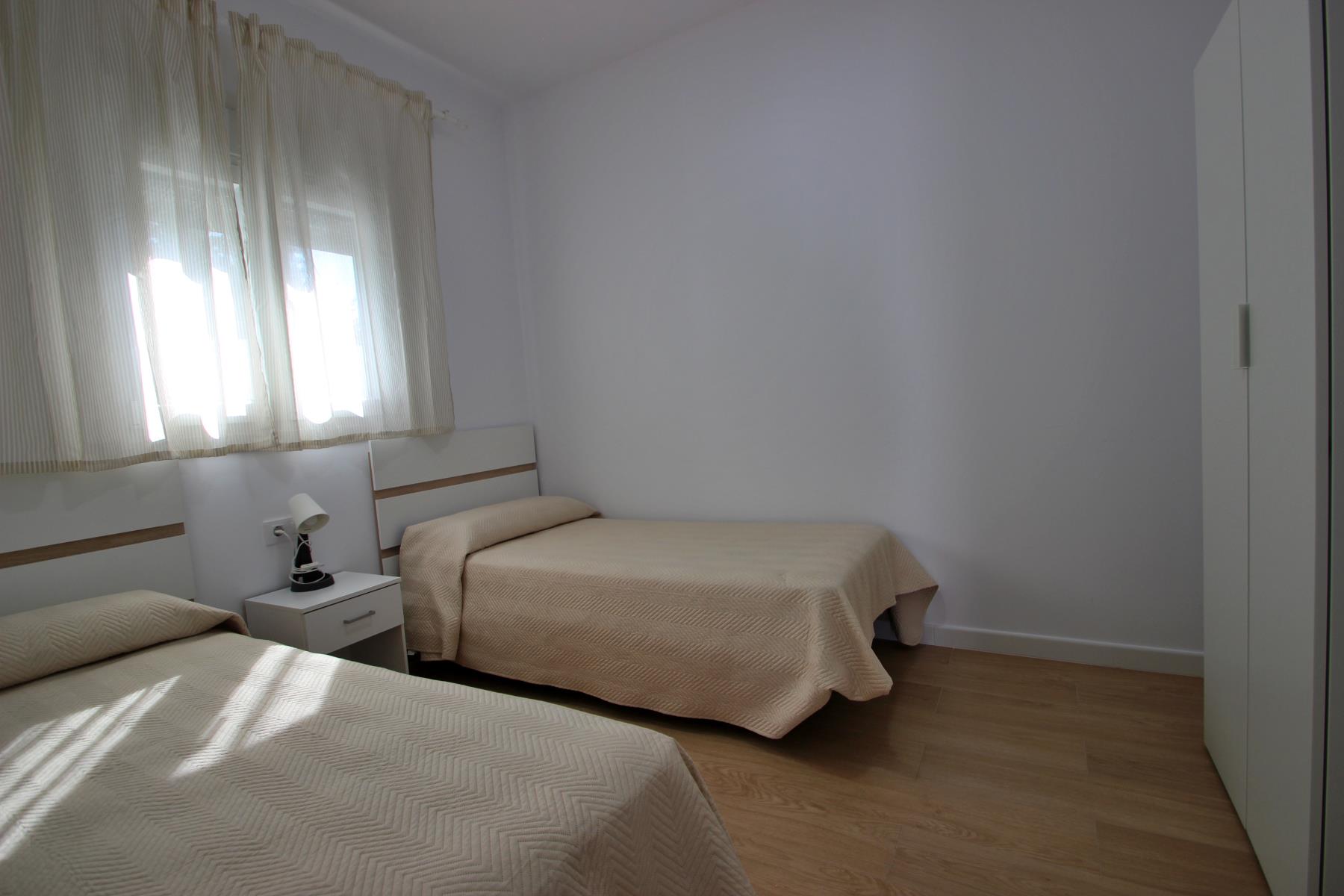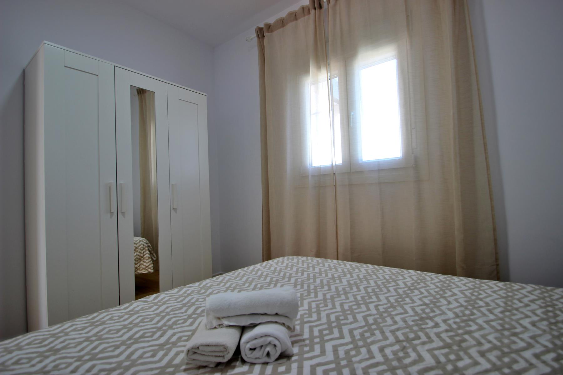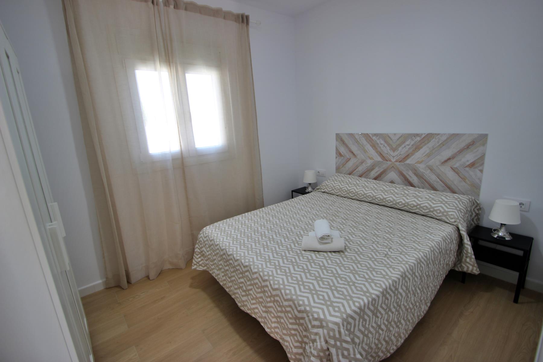 The bright and comfortable living-dining area includes a sofa, television with Spanish and international programs vía SAT, air conditioning, and Wi-Fi, creating the perfect space to unwind or enjoy family time. The open-plan kitchen blends seamlessly into the room and is fully equipped with a dishwasher, microwave-grill, ceramic hob, coffee maker, toaster, and all essential kitchenware. A washing machine is also available, making it ideal for longer stays.