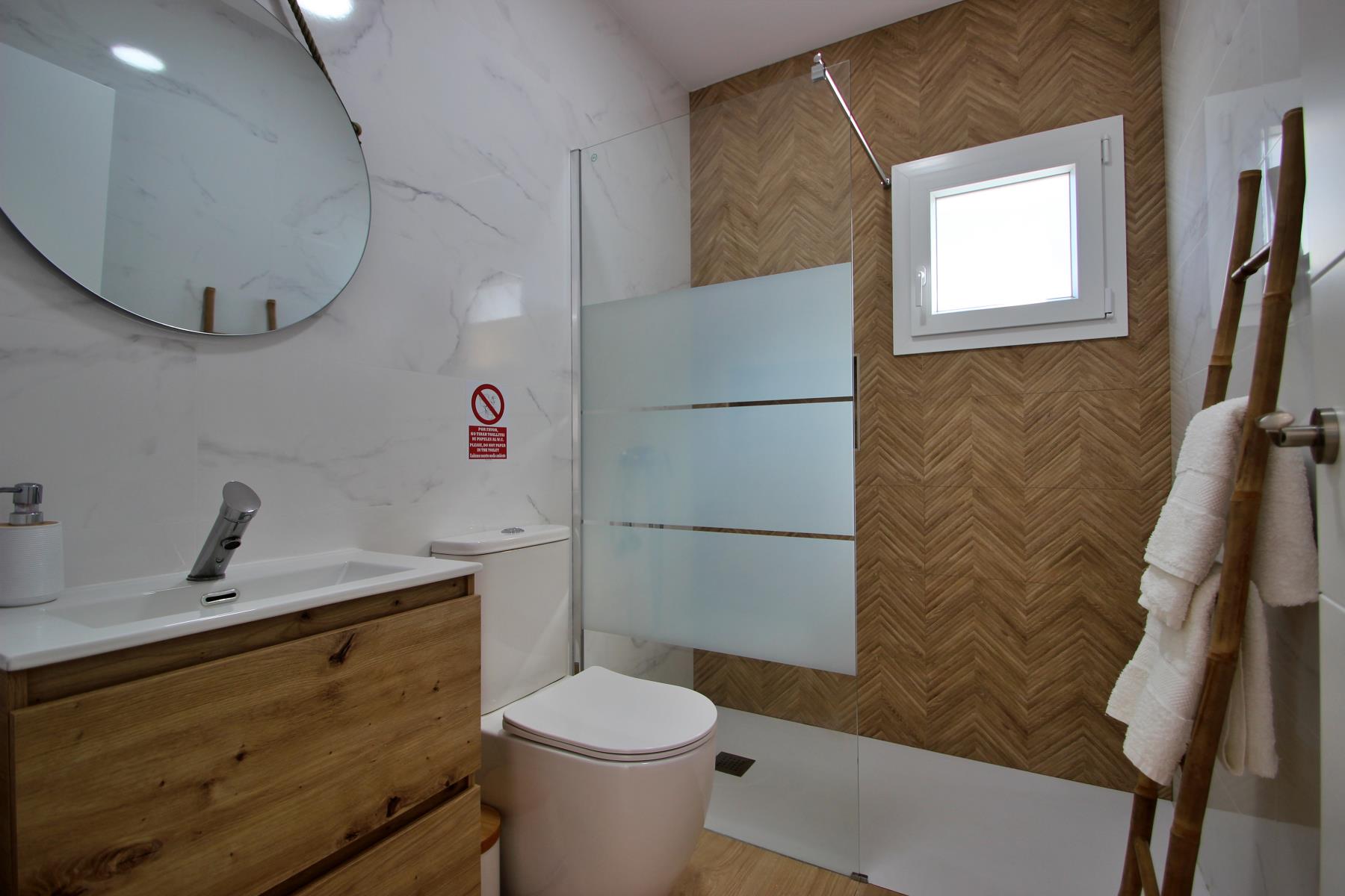The modern bathroom features a spacious and functional shower.