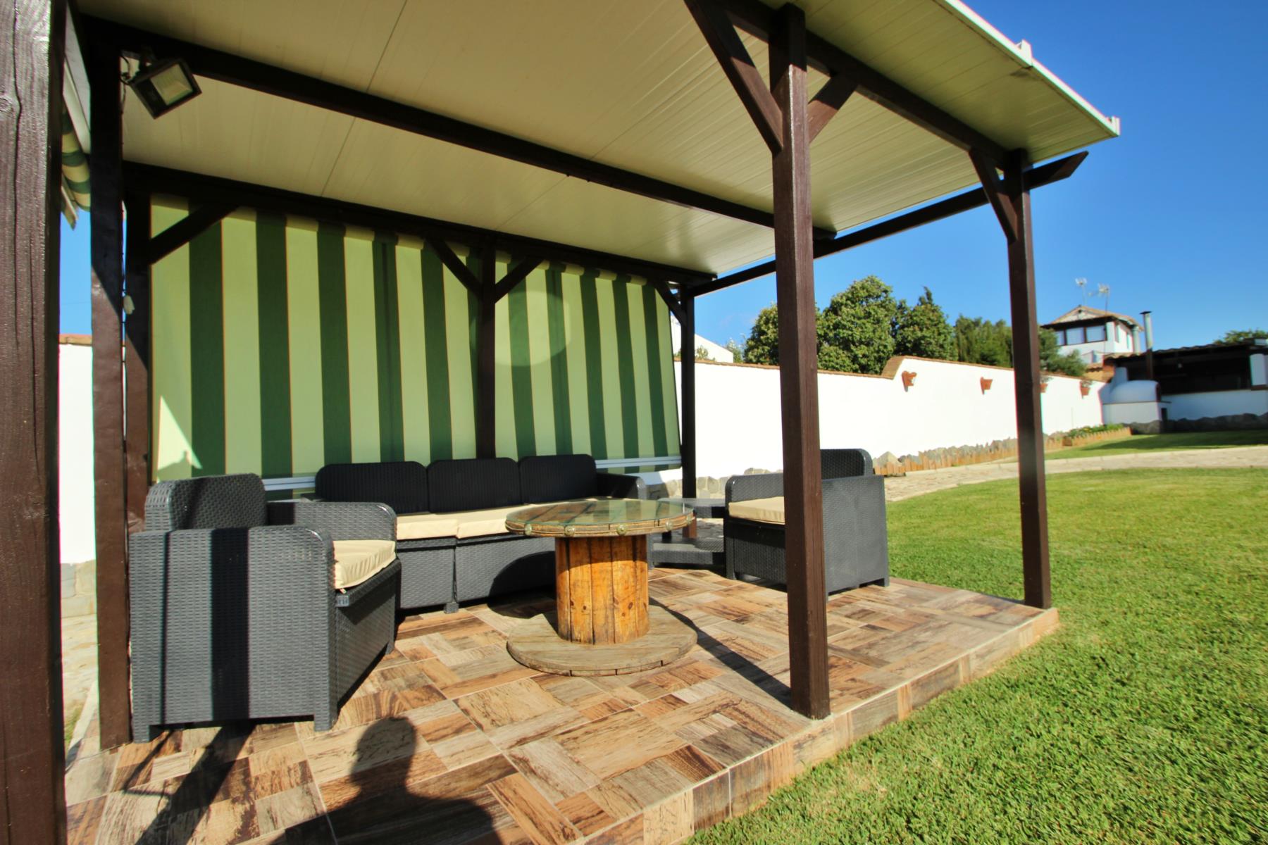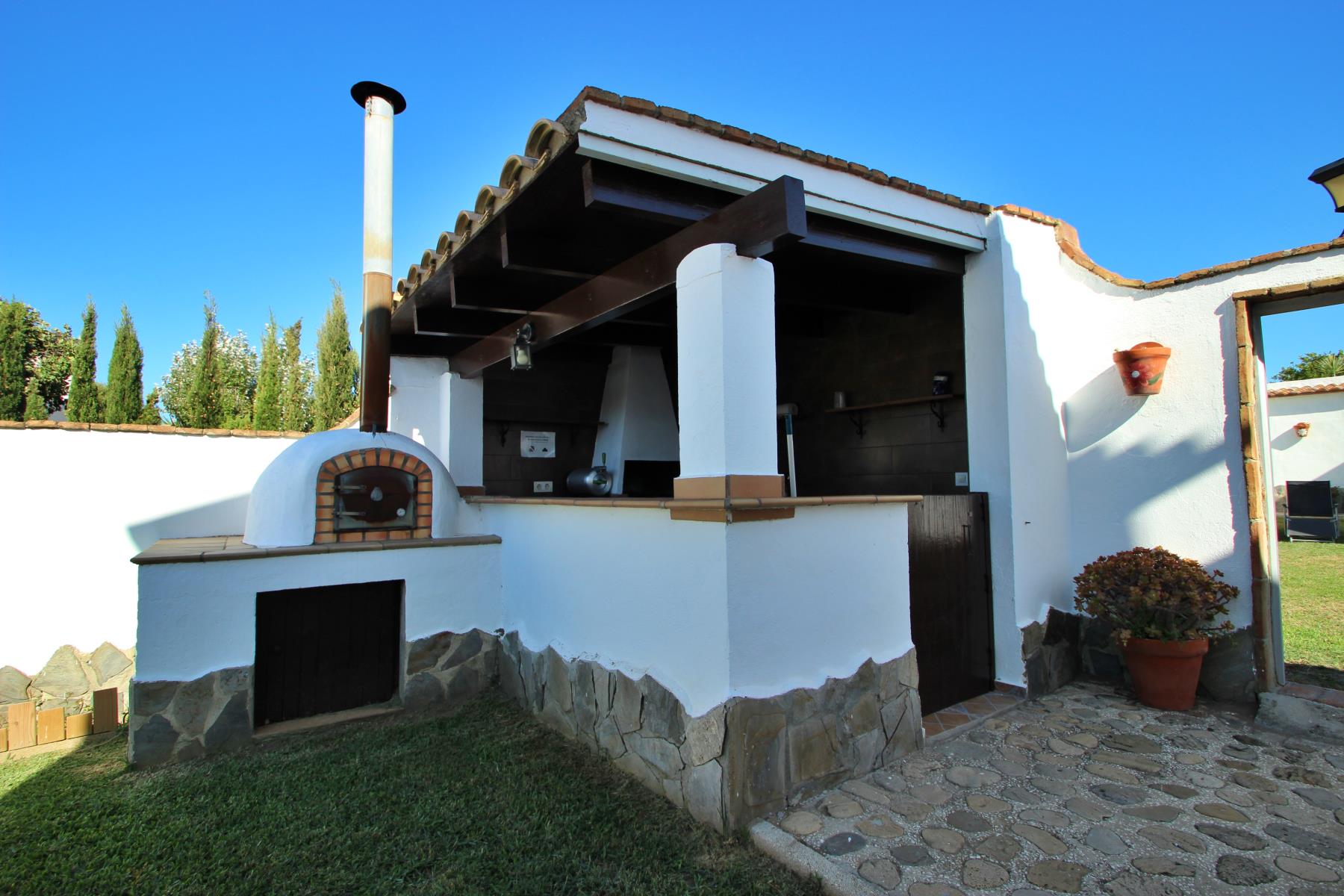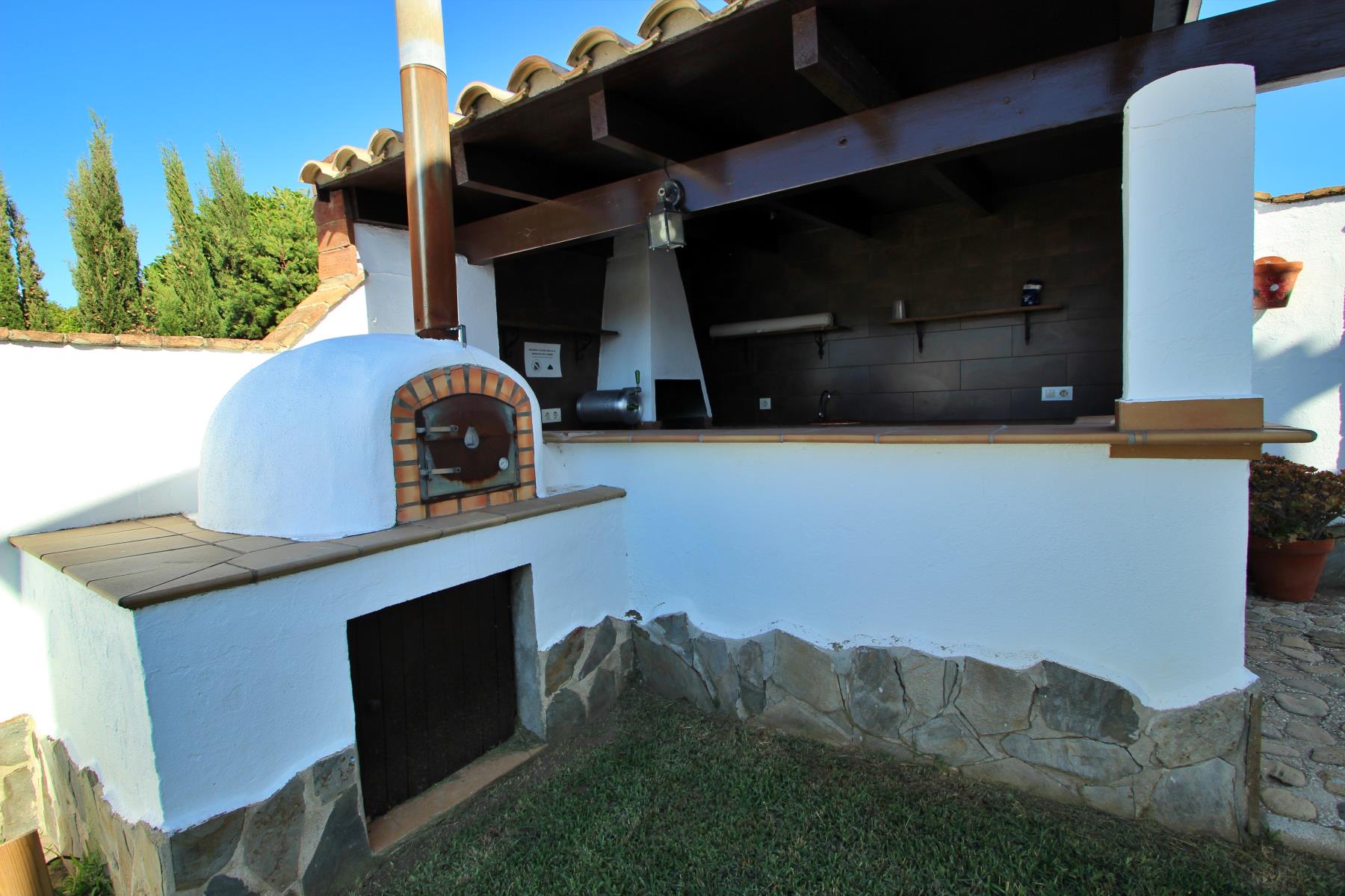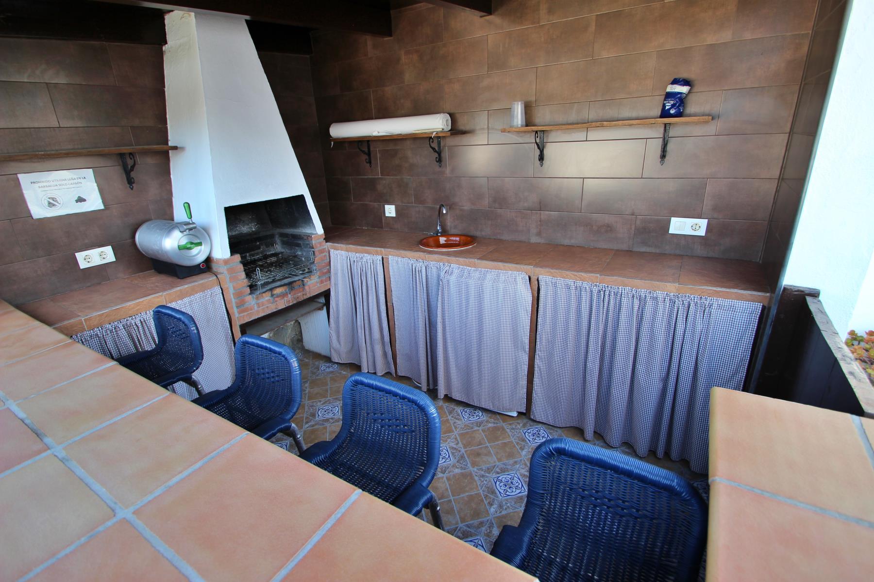Anexa a la casa se encuentra una zona de barbacoa cubierta y totalmente acondicionada, equipada con barbacoa tradicional y horno de leña. El exterior incluye además un porche cubierto con mesa y sillas.