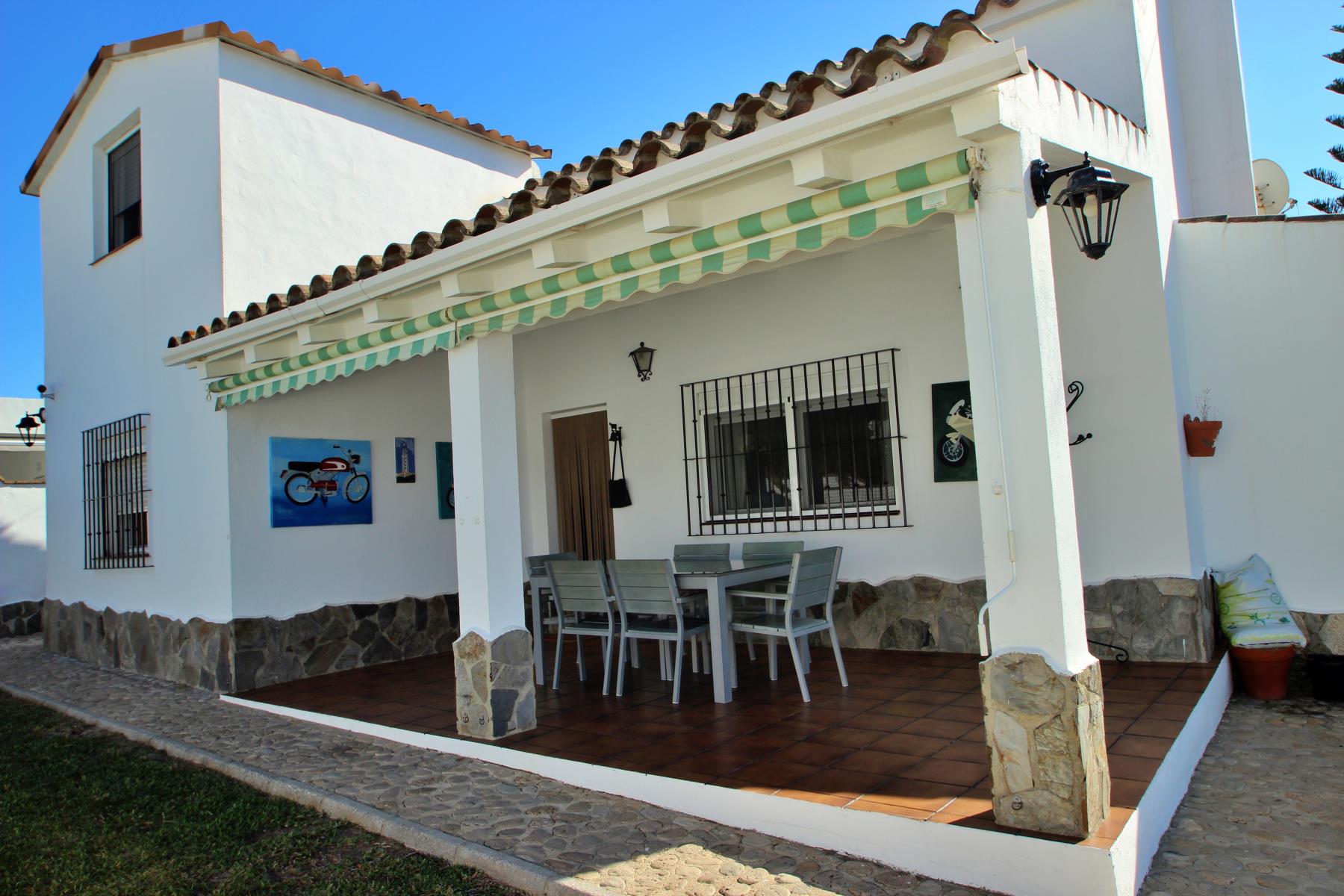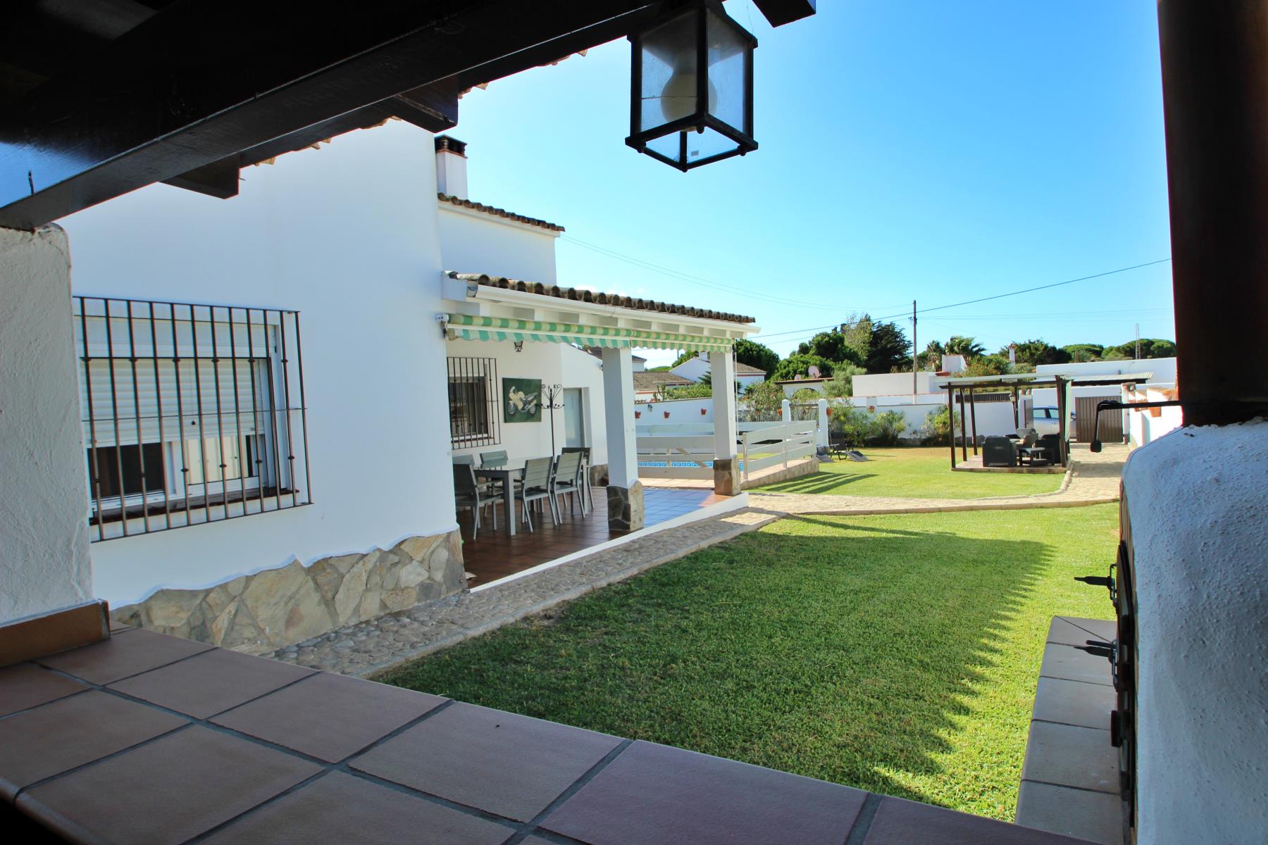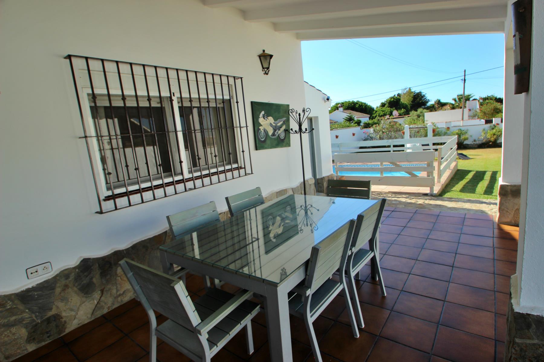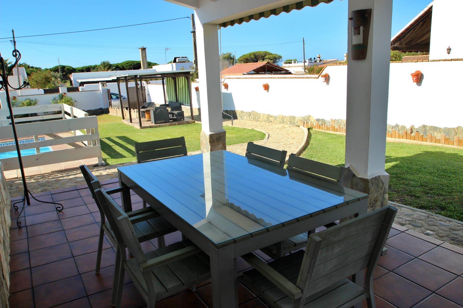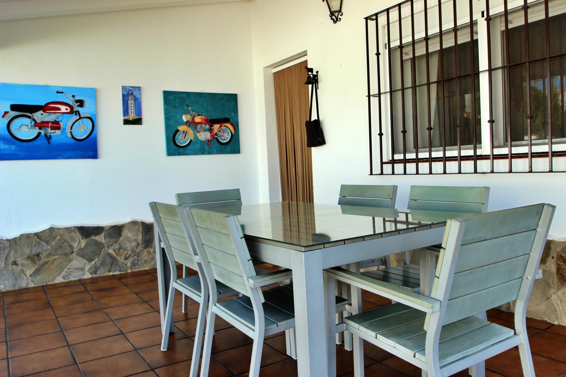 Anexa a la casa se encuentra una zona de barbacoa cubierta y totalmente acondicionada, equipada con barbacoa tradicional y horno de leña. El exterior incluye además un porche cubierto con mesa y sillas.