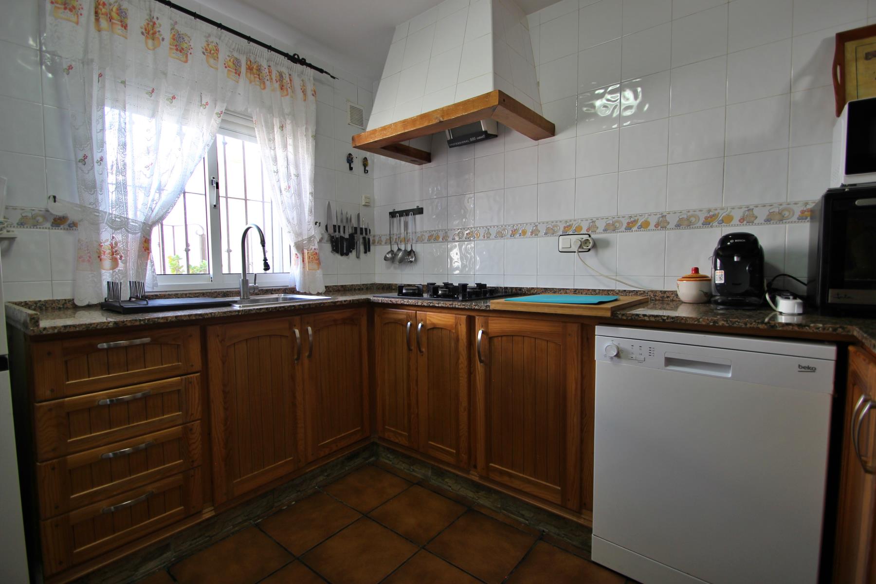 Abierta al salón-comedor está la cocina, completamente equipada con microondas-grill, lavavajillas, fogones de gas, cafetera, tostadora y todo tipo de utensilios. En el exterior hay además una lavadora disponible.